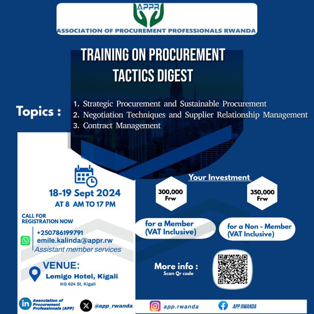 The overall mission of APPR is to coordinate, monitor and promote procurement professionals in Rwanda, through improving and maintaining the standards of ethics of procurement professionals, facilitate transfer of procurement knowledge to professionals and other stakeholder as well as protecting and safe guarding the procurement profession.